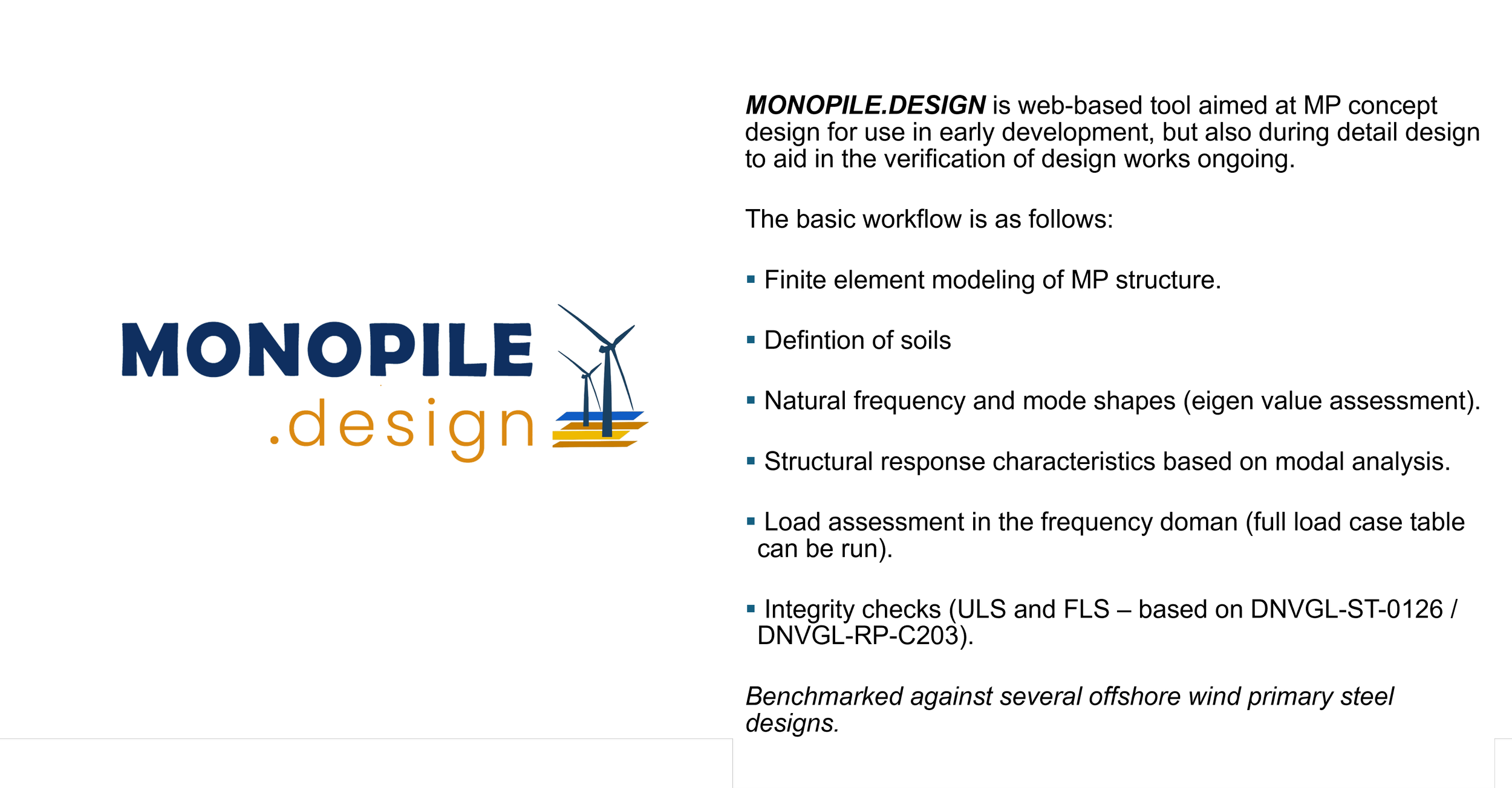 • Speed: If all inputs are available, a monopile can be designed within a few days.